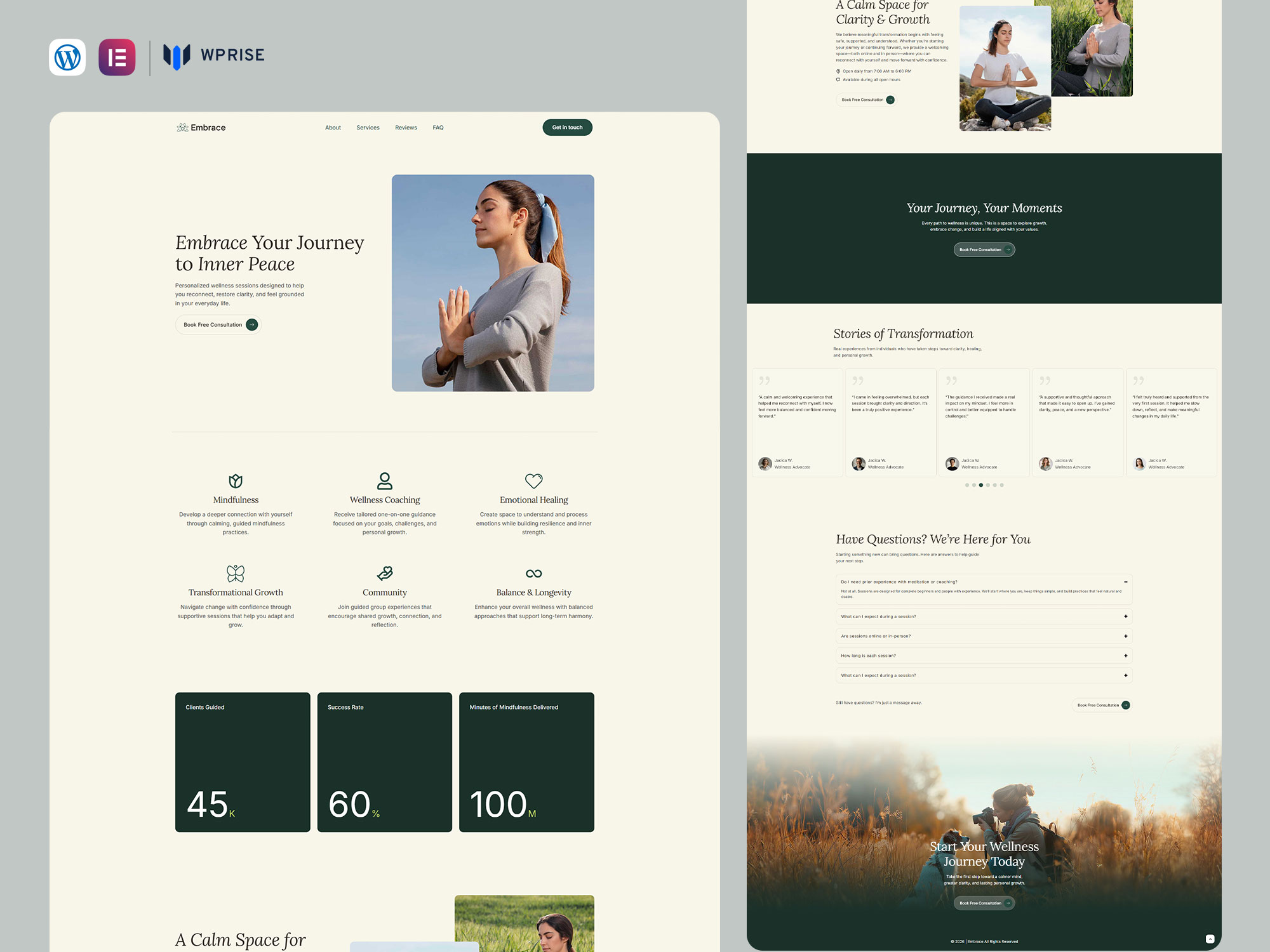 Embrace is a wellness and coaching landing page template built with Elementor, featuring a clean design, lead generation sections, and one click demo importer for easy customization.
