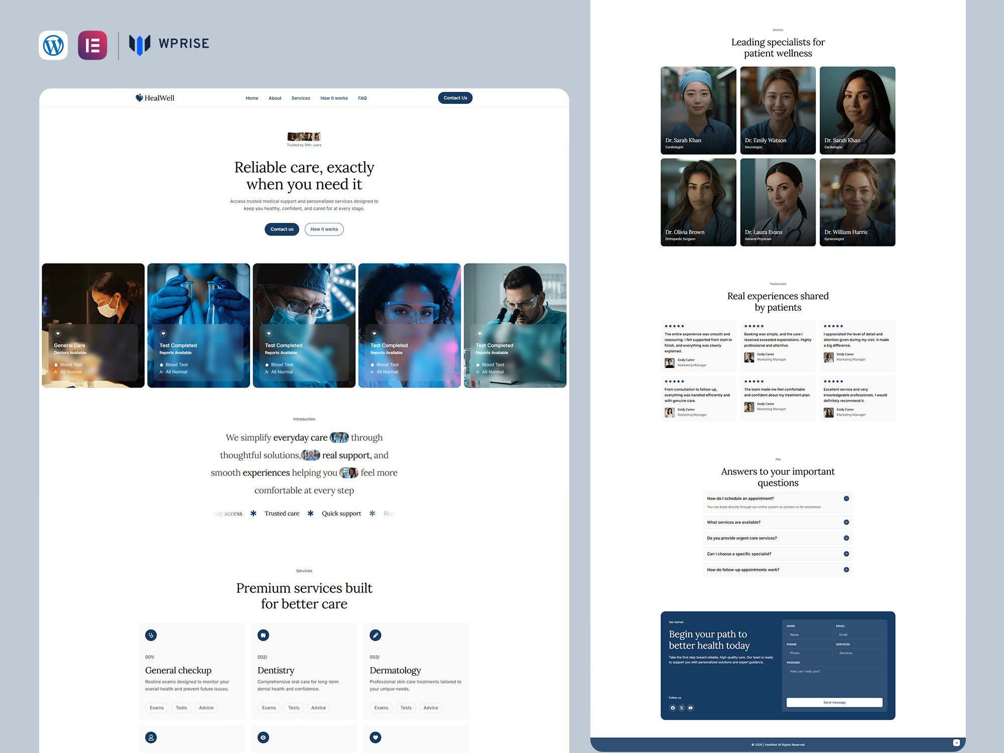 HealWell is a healthcare landing page template built with Elementor, featuring a clean design, appointment forms, and SEO optimized structure with one click demo importer for clinics and medical services.